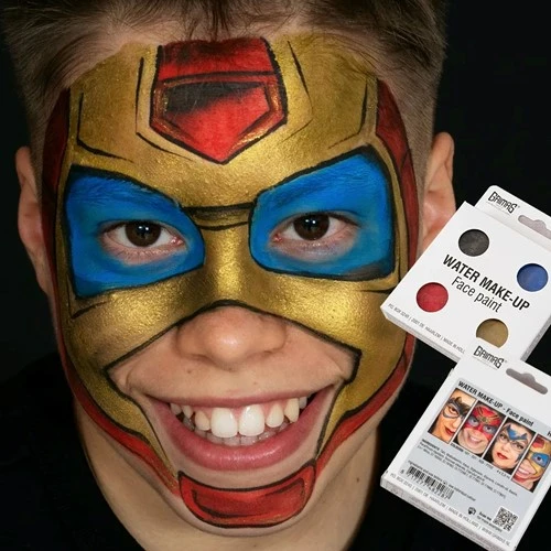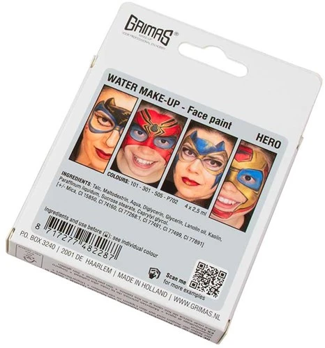 De Hero Schminkset van Grimas bevat de kleuren zwart (101), blauw (301), rood (505) en goud (702). Deze veelgebruikte kleuren vormen de basis voor tal van leuke schminkvoorbeelden. Gebruik deze kleuren om de held uit te hangen, of breng de moed op om zelf iets te verzinnen.