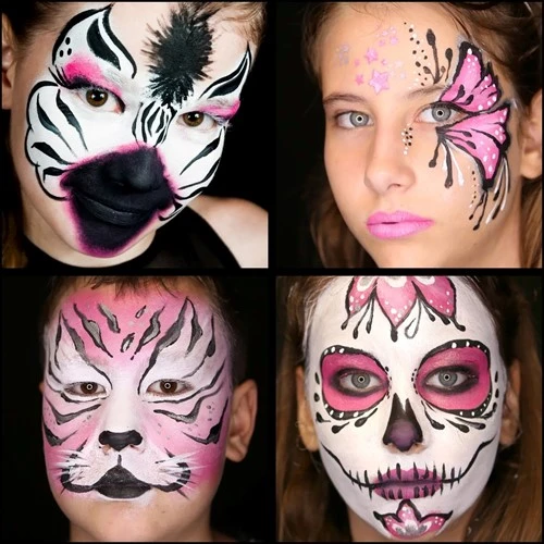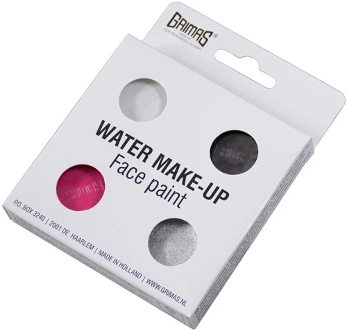 De Fantasy Schminkset van Grimas bevat de kleuren wit (001), zwart (101), roze (508) en metallic zilver (M701). Ga voor één van de schitterende voorbeelden op het doosje, of laat je fantasie volledig de vrije loop en bedenk zelf een creatie met deze kleuren.