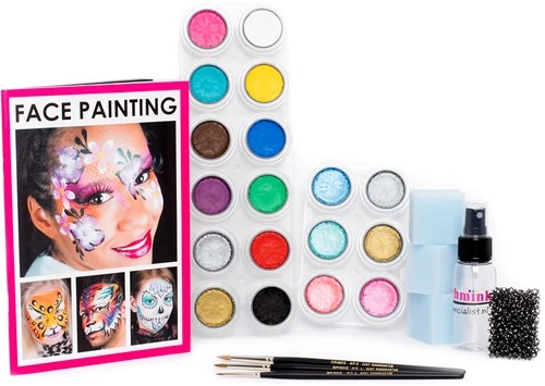 Dit Schmink pakket D bevat alles wat je nodig hebt als beginnend schminker. Met dit schminkpakket heb je een prima basis met 18 kleuren Grimas Water Make-up waarmee je kan schminken. Grimas Water Make-up is een ongeparfumeerde en glutenvrije watermake-up, bedoeld voor gezichts- en lichaamsbeschildering. De schmink kleuren van Grimas zijn onderling mengbaar. De schmink van Grimas mag op de slijmvliezen en rondom de ogen gebruikt worden en voldoet aan de Europese cosmetica wetgeving.