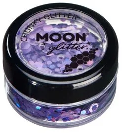 De chuncky glitters van Moon Creations zijn grove glitters van verschillende grootte door elkaar gemixt. De holografische festival glitters schitteren in het licht en voegen regenboog effecten toe aan elk geschminkt gezicht. Deze festival glitters worden veel gebruikt met carnaval, op festivals, voor een feestelijke make up maar ook voor bodypaint of in het haar is het effect super mooi.