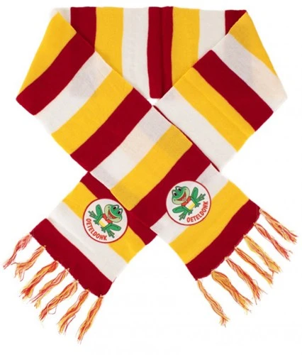 De rood wit geel gebreidde sjaal heeft een afmeting van 200 x 20 cm en is voorzien van een logo met kikker en de tekst Oeteldonk.