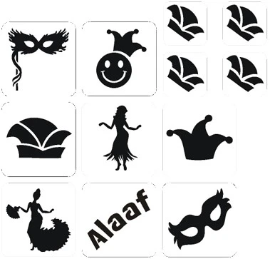 Met deze carnaval glittertattoo sjablonen maakt u heel eenvoudig een leuke glittertatoeage in het carnaval thema.