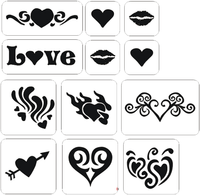 Met deze in de hartjes glittertattoo sjablonen maakt u heel eenvoudig een leuke glittertatoeage in het thema liefde.