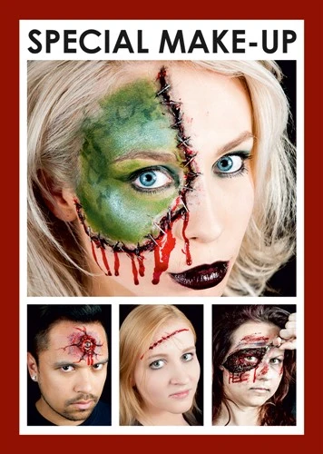 Het Special Make-up boek is heeft een soft cover, telt 50 pagina’s en heeft een handig A5 formaat van 14,7 x 21 cm. De verwondingen, special fx en halloween voorbeelden in dit boekje zijn: snee in vinger, blauw oog en schaafwond, snijwond, schotwond, gebroken neus, doorgesneden keel, opengescheurde mondhoeken, brandwond, etterende wond, vampier beten, klauwenwond, wond met hechtingen, penseel door de neus, opengevouwen oogleden, derde oog, zombie rits, cyborg, Billy the Puppet, galaxy en de Bruid van Frankenstein.