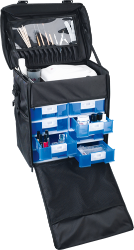 De Make-up artist tas kunt u via de extra band aan de achterkant, over het handvat van de Make-up trolley professional schuiven. Zo heeft u nog meer opbergruimte, en toch maar 1 tas te vervoeren.