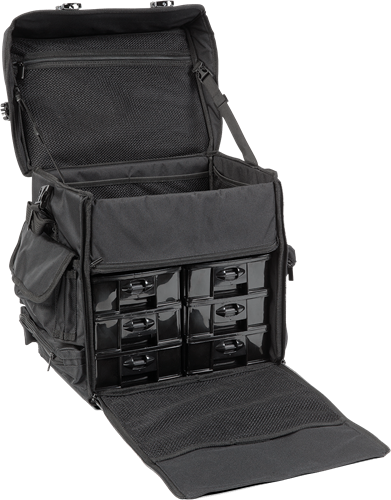 Aan de bovenzijde van deze tas zit een groot opbergvak, aan de voorzijde meerdere kleine opberglades. De lades kunt u desgewenst ook uit de tas halen.