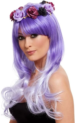 Deze deluxe Sugar Skull pruik in de kleur paars wordt compleet met bloemen geleverd.