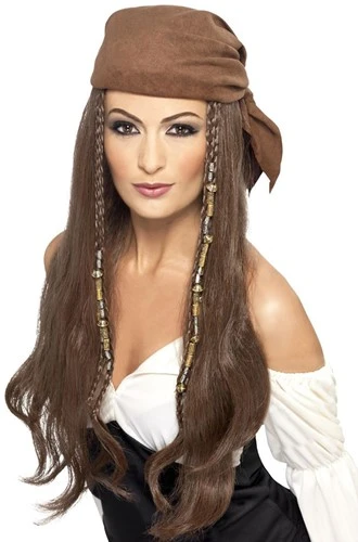 Deze bruine Piraten pruik wordt compleet met bandana, vlechtjes en kralen geleverd.
