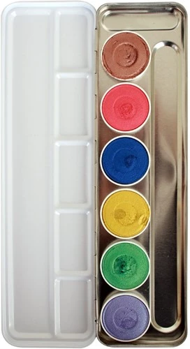 De matte kleuren zijn uitermate geschikt voor het schminken van de basis en het zetten van lijnen. De glanzende Shimmer kleuren schmink zijn wat zachter en daarom zeer geschikt voor het schminken van de basis van je creaties. Omdat de shimmer kleuren wat zachter zijn, heb je weinig water nodig om de schmink te activeren.